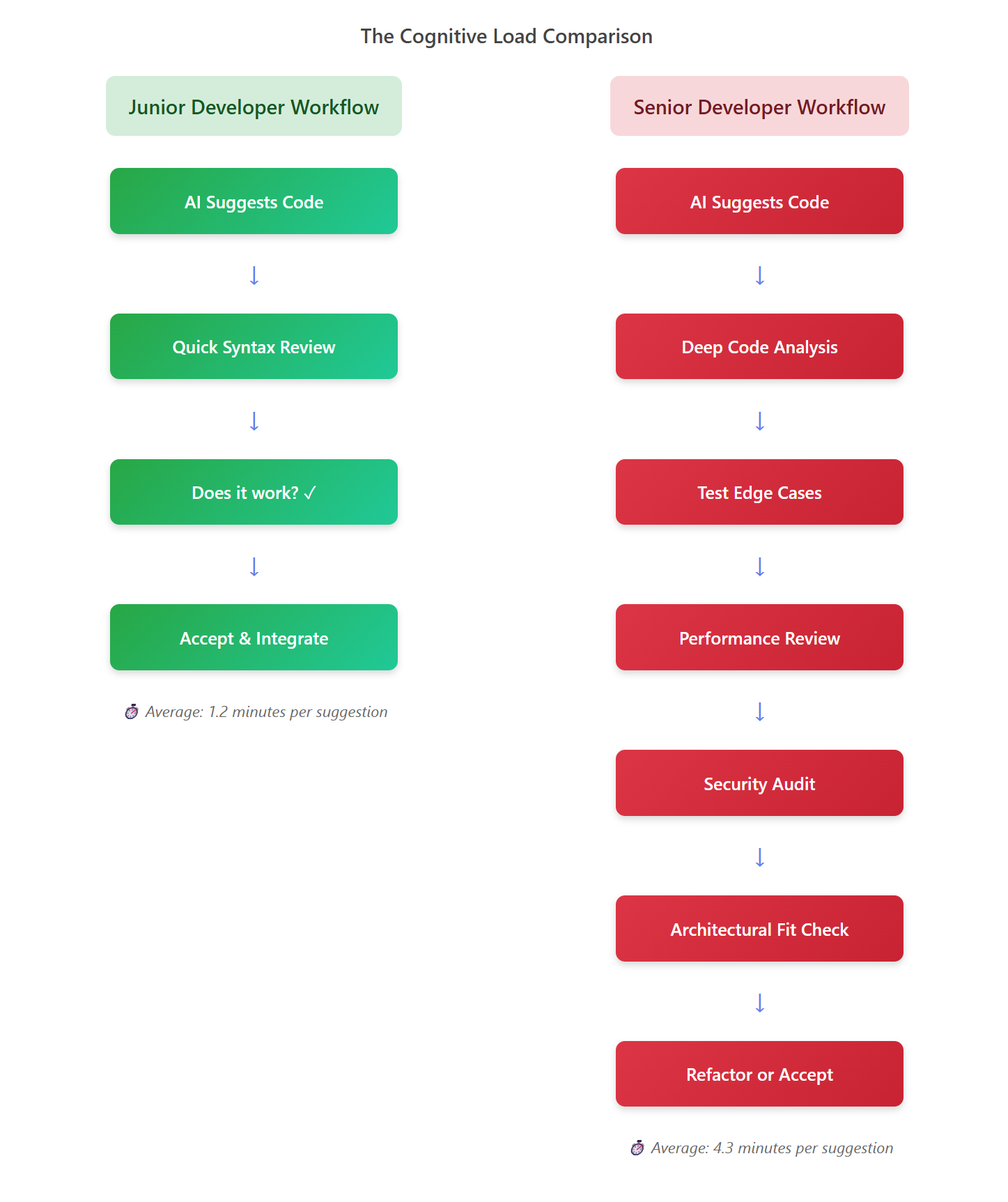 Kıdemli yazılımcılar, sistemlerin nasıl çalıştığına dair zihinsel modeller oluşturmak, uç durumlar (edge cases), performans etkileri ve mimari takaslar hakkında zor kazanılmış bilgiler toplamak için yıllarını harcarlar. AI Copilot kod önerdiğinde, bunu basitçe kabul edemezler. Uzmanlıkları onları her satırı doğrulamaya zorlar.
